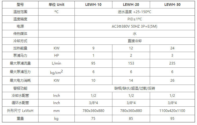150度高溫水溫機溫控器:采用觸摸式數字顯示雙組微電腦自動演算型.循環泵:采用與軸封泵浦,提供高壓力.減少溫差.外型設計:分離式控制箱設計,油氣熱量侵入,延長電氣零件.機電材料:采用日本[FUJI] [OMRON]等組件,150度水溫機電路設計:連鎖防錯電路及實用故障指示,保護模溫機穩定工作. 管路設計:150度水溫機采用304不銹鋼一體成型管,全焊接管路設計,耐酸堿,管損小,加熱均勻,且可以降低介質發生熱解反應. 加熱裝置:瑞典電熱絲,微電腦全自動三段式加熱法。