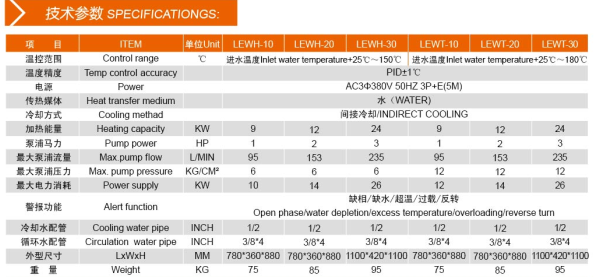 高溫水加熱器泵浦采用臺灣元欣高溫渦流泵或者德國SPECK高溫聯軸齒輪泵,耐高溫180度高流量高壓力.溫控器采用高液晶數顯型雙PID溫控器,控溫±1度,省電30%以上.高溫水加熱器瑞典絲雙功率加熱器,使用長,適合不同控溫場所使用.內部管路304不銹鋼一體成型,加熱均勻管損小,接口選用耐高溫藍膠,漏水現象.管路防爆裝置獨特的加熱設計,溫度自控快速達到各種產品所需溫度的要求.提高生產效率和產品質量,升降溫速度快,溫度均勻穩定,水溫機開機自動排氣回水溫度顯示,RS485通訊功能,實現自動化管理,設定值和實際值分別顯示.