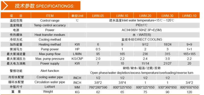 工業水加熱器提高產品品質:PID自動控制溫度,迅速達到所需的溫度且始終保持恒溫,大幅降低成型品之不良率,產品品質.工業用水加熱器:兩段式加熱結構設計,可視所需之溫度增減電力,并配合特殊之發熱構造,可省時省電.保護裝置:無熔絲開關,缺水或缺油,溫度異常及泵浦過負荷等自動警示系統,回路能自動切斷,.工業用水加熱器控溫:選擇配備的PID智能型自動演算的溫度控制器,能顯示和控制模具溫差于所需溫度±1℃ 內.工業用水加熱器售后服務:全國設多個售后服務點,整機保修一年,永久支持免費技術咨詢.