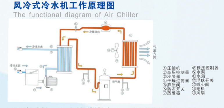 風冷式冷水機在它機身內含有保溫水箱和水泵,無需再另加冷卻水塔來散熱.安裝和移動非常方便.但是它對工作環境要求較高,首先,因為它是以熱風循環來制冷的,所以,如果安裝車間的通風效果不好的話,會直接影響到風冷式冷凍機的制冷效果.另外,如果放在有濕度要求的無塵車間里的話,那么我勸您改裝水冷的.因為風冷工業冷水機會在機頂噴出水蒸氣以散熱。